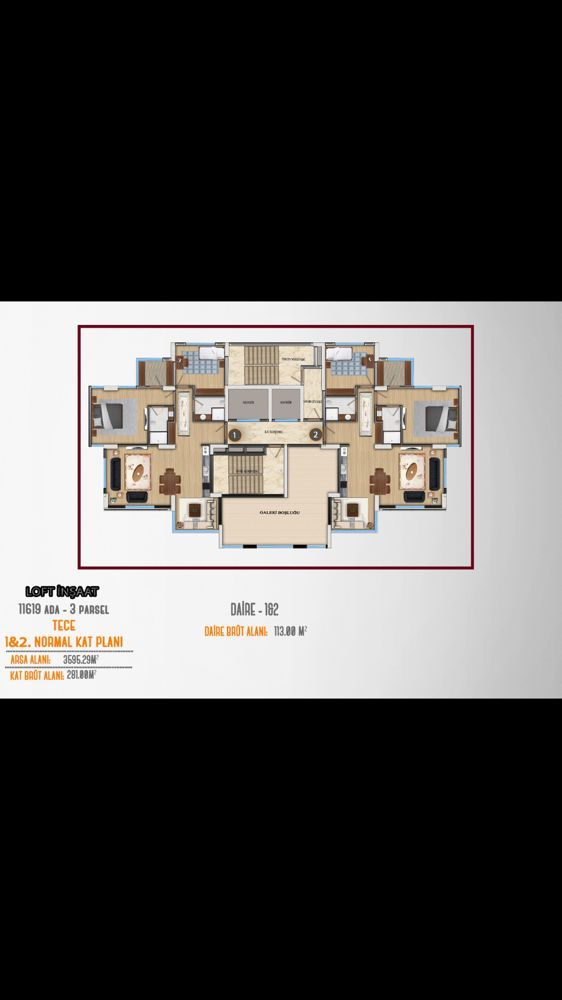 Имеются квартиры 2+1 линейные и 2+1 лофт. Реальная площадь 77 м2. В каждой квартире 2 ванных, в одной из спален имеется гардеробная