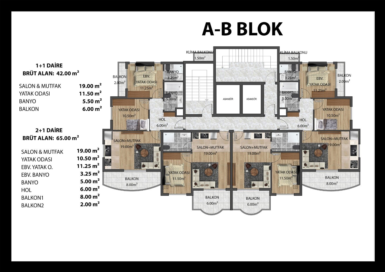 В продаже квартиры 1+1 — общей площадью 42 м2, и 2+1 — общей площадью 75 м2 с 2 балконами и 2 с/у